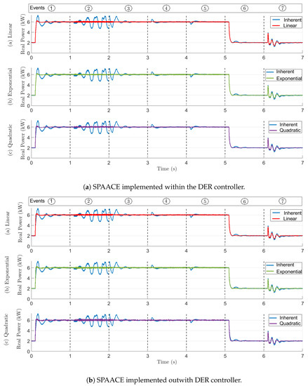 - Induction motor energization: Event 7 evaluates the response of the DER subject to a switching transient on the network. For the system under study, the switching transient is emulated by the energization of a 7.5 kVA induction motor. The response of the DER is shown in column 7 of Figure 6a,b. From the performance indicators presented in Table 4, it is evident that SPAACE improves the system performance with minimum overshoot reduction of 4.85% and a 7.4% reduction in settling time.