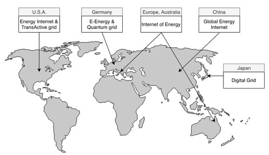 Future Renewable Electric Energy Delivery and Management (FREEDM) systems center at North Carolina State University presented the key technologies required for Energy Internet architecture []. Later, the term TransActive energy systems came into existence with similar characteristics of Energy Internet [,]. Though the objective of Energy Internet and TransActive energy systems are to balance electricity demand and supply through energy trading in a renewable energy dominating system, the TransActive grid does not focus on internet like network infrastructure that witnessed in Energy Internet. In Germany, E-Energy is an initiative by the Federal Ministry for Economics and Technology (BMWi), and the Environment, Nature Conservation and Nuclear Safety []. The goal of E-Energy is to develop the existing smart grid system to integrate electric vehicles through ICTs and to optimize the energy system []. The Quantum Grid is an Energy Internet associated concept with a packet-based power transmission. The idea of Quantum Grid is like the transmission of data packets in internet. Here, power is transmitted as energy packets between the sink and the source in the chosen path determined by the routing algorithm controlled by Quantum Grid Routers [,]. Internet of Energy and Global Energy Internet are synonyms for Energy Internet. Researchers across the globe have identified that the Internet of Energy has similar characteristics as that of Energy Internet accepted by researchers in USA and China [,]. Global Energy Internet focuses on the worldwide network of Energy Internet which makes cross-border power trade possible []. Japanese version of Energy Internet is known as Digital Grid which envisions blockchain based energy market which is facilitated through Digital Grid Router [].