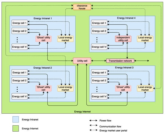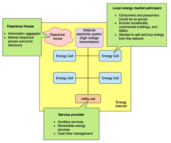 As stated earlier, there are three major types of entities in the Energy Internet. They are, Energy Cells, Utility Cells, and the Clearance House [,]. In this section, we have conceptualized these entities in detail. Any attempt to categorize energy cells in this way has so far not been reported in the literature, but to capture all stakeholders of power sector we believe, this categorization is essential. Figure 7 shows the network structure of Energy Internet.