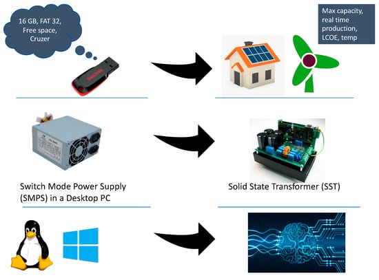 Energy Internet has mimicked certain features of information internet such as plug-and-play mechanism, information routers, open source software platform, etc. []. However, Energy Internet distinguishes itself in terms of how the internet technology is applied for exchange of information, to facilitate bidirectional power flows and money flows. Figure 4 shows a comparison between features of internet network device and Energy Internet. Plug-and-play mechanism in the Energy Internet allows distributed renewable energy systems to couple and de-couple with the system without disturbing its energy balance. On the end-consumer side, energy router is equipped with solid-state transformer (SST) to cater to various energy needs of the consumer. Conversion of DC power generated by solar PV, and electric vehicle battery are performed by SST along with catering to various electrical loads connected to the system. Functioning of SST is like the Switch Mode Power Supply (SMPS) in a personal computer. SMPS supplies power to various components depending on the electrical specifications []. Software control of these are engineered to feature into a distributed grid intelligence system (DGI) which is an open source platform like Linux operating system (OS) in a PC. Various customizations are done by present day programmers on Linux like OS and can be replicated in DGI for better energy utilization and optimize operation of the system. Perfect example for open source software is Raspberry Pi which enables cost reduction of various devices in Renewable Energy Monitoring Systems []. Moreover, for hardware, the Arduino platform, which is used in SCADA systems [] and electric vehicle charging stations [], are considered as examples.