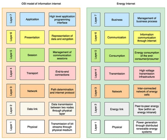 Open Systems Interconnection model (OSI) reference model and proposed seven-layer architecture. Source: OSI model [] and Energy Internet Architecture (Authors’ contribution).