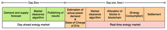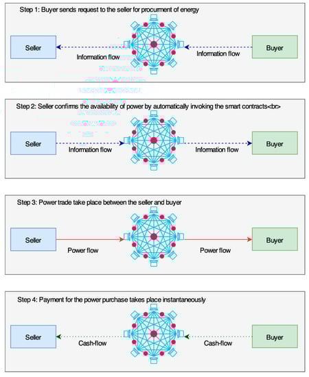 Emerging technologies, such as big-data analytics, cloud computing, Internet of Things (IoT), and blockchain have wide possibilities in facilitating synchronization of renewable energy systems with national grid as well as energy trade in distributed energy systems in an open platform. Big data analytics and cloud computing can support energy management, demand response and fault detection []. IoT is useful in electricity systems for several applications including automated metering infrastructure, and energy storage [,]. Blockchain technology has vivid applications in energy industry such as metering/billing, bill payments, grid management, green certificates, and carbon trading, and decentralized energy trading []. The availability of blockchain technology which works seamlessly with IoT and cloud computing can facilitate tracking of bidirectional flow of electricity between two prosumers []. Depending on their status (surplus or deficient), the consumers with local renewable energy generators (prosumers) can either sell or buy electricity anonymously. Bidirectional communication possibilities enable real-time information transfer between prosumers on energy supply and demand, price, storage, etc. Bidirectional money flow facilitates the possibility of instantaneous payment between the prosumers. Bi-directional payments can take place through various payment channels such as Unified Payment Interface (UPI). Therefore, it can be inferred that the technologies have evolved into a state at which electricity markets with bidirectional electricity, communication, and money flows can function seamlessly.