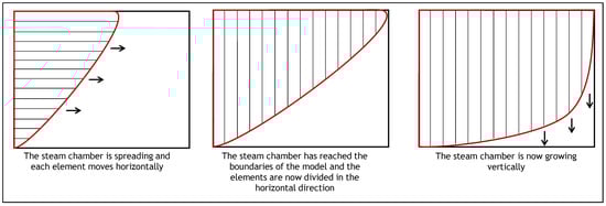 The elements in which the steam chamber is divided are constantly expanding as the process proceeds. The upper elements will move faster than the lower ones and eventually, the element at the uppermost element will reach the model boundary. This situation may represent the moment where the steam chamber reaches the reservoir boundaries, or it may be due to the steam chamber coming into contact with the steam chamber from an adjacent well pair. This situation is represented by an additional step in the calculation in which the model is divided into equally spaced elements in the horizontal direction once the top element has reached the boundaries as it is shown in Figure 4. Depending on the direction of the movement, the elements’ location is calculated using Equations (5) and (6) as explained by Butler [].