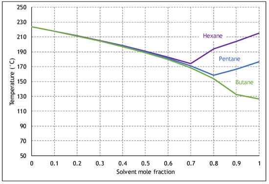 As heat is transferred from the injected fluid to the reservoir, the steam temperature begins to decrease, and condensation occurs. This will in turn increase the solvent mole fraction in the mixture until it reaches a saturation temperature below which only two liquids phases (solvent and water) are at equilibrium. Figure 5 shows the phase boundary for mixtures of water and hexane, pentane, and butane at 2.5 MPa. It can be seen that these temperatures can differ considerably. For example, in a steam–pentane mixture in which the concentration of pentane is 10% mole, the dew point temperature at 2500 kPa is 217.6 °C. This temperature is less than the dew point temperature of pure steam at the same pressure: 223.6 °C. However, as the solvent concentration increases, at a constant pressure of 2500 kPa, the temperature can fall as low as 158.3 °C. In addition to this, the solvent concentration at the interface is also changing during the cycles. Thus, for the same steam–pentane mixture the pentane mole fraction and temperature at the interface are 0.803 and 158.3 °C, respectively. If the temperature at the interface subsequently starts to increase during the steam cycle, then this solvent concentration will be reduced accordingly.