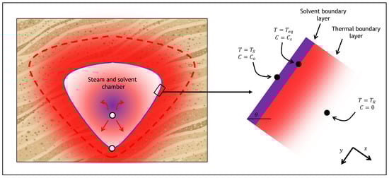 In the previous equation, represents the effective solvent–bitumen molecular diffusion coefficient, is the solvent concentration in the bitumen, and is the transverse dispersivity factor. Before reaching the interface, the concentration increases starting from its initial value at the injection point, . Subsequently, in Equation (7), it is assumed that the solvent concentration changes from a maximum value at the interface, , to zero at some distance ahead in the reservoir. As seen in Figure 5, the maximum concentration value is associated with an equilibrium temperature, and depends on the type of solvent and its initial concentration in the injected mixture. It is important to note that in the model of Rabiei [], the value of is deduced from the steam–solvent phase equilibrium; it is subsequently used to model the maximum solvent concentration in the bitumen. The assumption that the maximum solvent concentration in the bitumen is equal to the maximum solvent concentration in the steam is only applicable in the interface [].