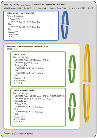 Similar to the SAGD and ES-SAGD analytical models, the number of equations that must be solved simultaneously necessitates the use of an iterative procedure with small time steps in which the calculations are performed for all the elements at each time step. The size of these time steps must be determined in such a way that it is possible to run the routine stably. MATLAB® was used to perform the calculation procedure. Figure 7 shows a flow diagram of the computational procedure, for cases in which the first cycle corresponds to the injection of steam plus solvent. In cases where the first cycle involves only steam the solvent mole fraction, in Figure 7, can be set equal to zero. This figure will be used as a reference to what will be explained in the following paragraphs.
