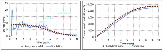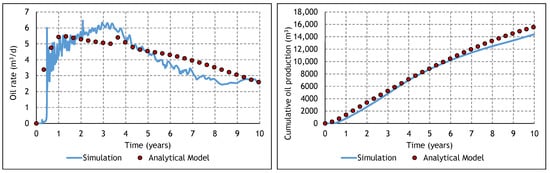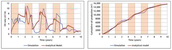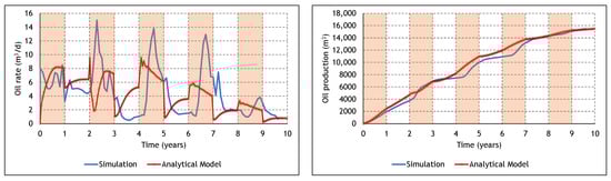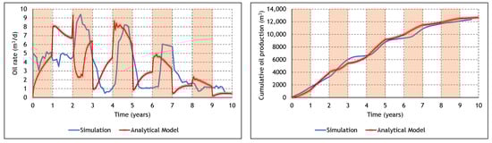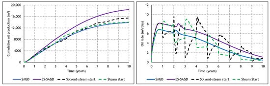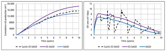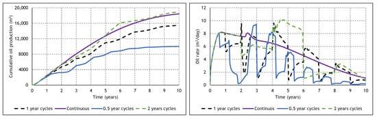 The length of each cycle as well as the starting mode are also important in assessing the performance of the cyclic ES-SAGD process. As it was previously noted, the time that elapses between one cycle and the other will affect the increase or decrease in the interface temperature that has a direct impact on the rate. Figure 16 shows the oil production rate and cumulative production for a cyclic steam–solvent injection of hexane at 10% mole using cycles of half a year, one year, and two years. There are considerable differences among the results even though the total amount of time in which the solvent was co-injected is the same for two of the cases (1-year cycle and 0.5-years cycles) and varies for the other case in a year. These differences were also observed in the numerical simulation study performed by Manfre Jaimes et al. []. This means that the order in which each cycle takes place has a significant impact on the performance of the process, and hence the final oil production.