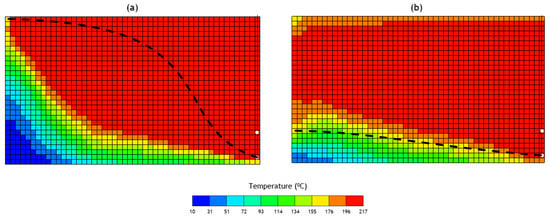 In an ES-SAGD process, the steam temperature and concentration of the co-injected solvent affects the behavior of the steam chamber and its interface, and it has been shown that the temperature at the interface is in turn influenced by the steam–solvent azeotropic behavior []. The addition of solvent in the injected stream will lower the saturation temperature of the mixture which consequently will also reduce the temperature of the steam chamber. Thus, in an ES-SAGD process, this temperature cannot be assumed to be equal to the interface temperature as it is in SAGD.