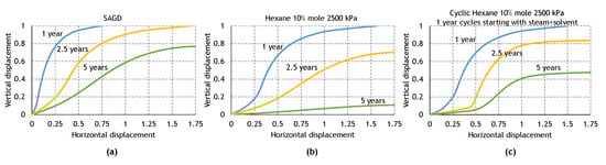 Position of the interface at 1, 2.5, and 5 years for a SAGD (a), ES-SAGD (b), and Cyclic ES-SAGD (c) case using hexane at 10% mole injected at a pressure of 2500 kPa.