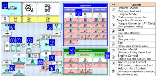 The fuel consumption simulation was conducted using CRUISETM from AVL, as shown in Figure 1. Furthermore, actual measurement data obtained from the gasoline/diesel engine and transmission efficiency at each gear were used for fuel consumption simulation. Additionally, real ECU/TCU mapping data such as desired torque map, gear shift pattern, and target fuel cut-in speed were applied to perform sophisticated analysis.