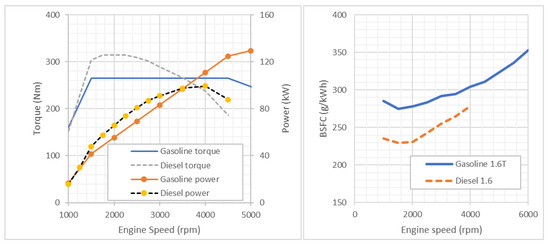 Figure 2 shows the maximum torque and power curve of gasoline and diesel engines and the fuel consumption rate applied in this study. Specifically, the diesel engine exhibited a lower fuel consumption rate by approximately 8–18% than the gasoline at BMEP 4bar (50~51 Nm).