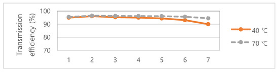 Figure 3 shows the average transmission efficiency at each speed with respect to the transmission fluid temperature. Specifically, the 7th speed has 5% higher transmission efficiency at 70 °C than at 40 °C.