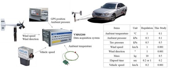 We used VMS3200 to measure coastdown time on track. An on-board anemometer was specifically used to measure wind direction and velocity in real driving conditions. Figure 4 shows the coastdown measurement equipment and the requirements and accuracy of the measurement system.