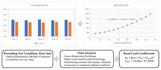 Subsequently, the neutral coasting time from 135 to 15 km/h, vehicle speed, wind velocity (speed, direction), and ambient temperature were measured five times in both directions of the straight road. Thus, they were measured a total of ten times. The measurements were used to calculate a total of eight unknown coefficients (Am, Bm, Cm, a0, a1, a2, a3, and a4) via a linear regression method. These coefficients were calibrated at standard temperature and atmospheric pressure conditions before the final road load coefficient was determined. The final road load coefficient was proportional to the second order of the vehicle speed (Figure 5 and Equation (1)).