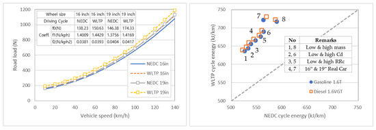 Figure 6 shows the relation between vehicle road load and tire size used in this test and simulation. Additionally, the driving energy per distance of the test cycle is shown in this figure. The driving energy is calculated by integrating the road load with respect to the speed of the driving cycle, i.e., NEDC or WLTP.