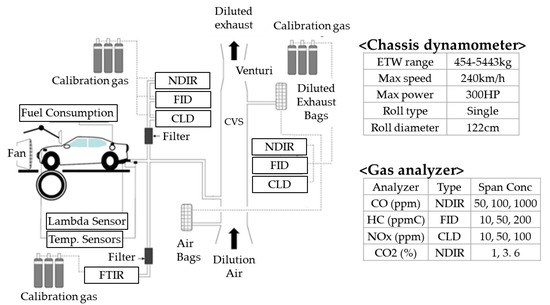 Figure 7 shows the overall schematic diagram of the chassis dynamometer and exhaust gas analyzer used for exhaust emissions and fuel consumption in this study. Measurement of vehicle emission gas was performed with a CVS (constant volume sampler) tunnel and emission gas analyzer. In the chassis dynamometer, real-time emission gas and vehicle data were collected for each driving speed by driving in the NEDC and WLTP modes. Furthermore, the final exhaust gas concentration was analyzed via the analysis of the sampling bag containing the exhaust gas. Gasoline and diesel fuel consumption were calculated by using carbon balanced Equations (2) and (3).