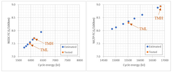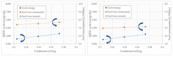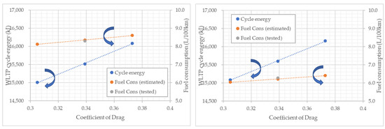 The influence of the vehicle’s drag coefficient on fuel consumption went up in WLTP regardless of the type of engine, and Pavlovic et al. [12] also showed an increase in the impact of aerodynamics on fuel consumption from NEDC to WLTP. Moon et al. [13] and Dimaratos et al. [14] also showed similar results through their simulation analysis.