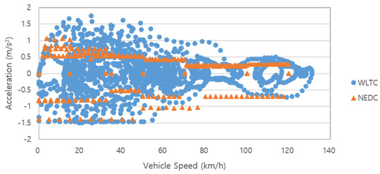 Yu et al. [6] analyzed driving characteristics in major cities in China by using traffic information and compared their results with those obtained from the WLTC mode. They conducted tests with NEDC and WLTC modes for 30 different car models to verify the effect of the cycles on the fuel consumption. Their results are similar to those in Table 2 [5], which are provided by ICCT. The results consider the effect of different test loads and ambient temperature on fuel consumption.