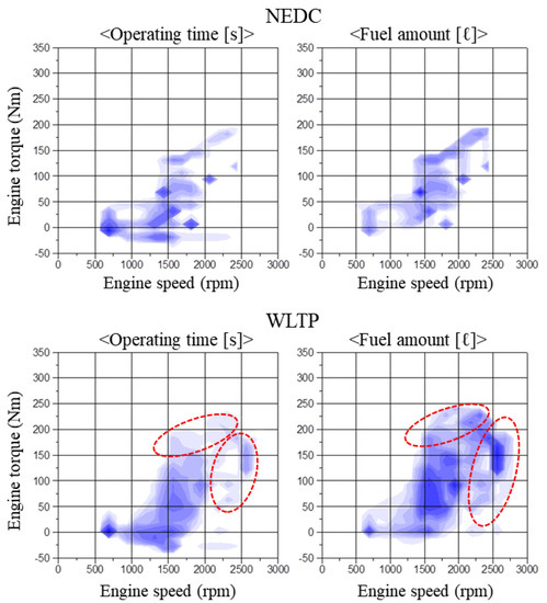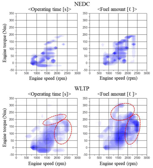 Figure 11 and Figure 12 show the distribution of the operating time and fuel amount for gasoline and diesel vehicle under NEDC and WLTP cycles. In this figure, the darkness in shade means high contribution. The engine operation zone significantly increased under WLTP compared to that under NEDC, due to increases in engine load and speed. In particular, the dotted line is an additionally expanded area compared to NEDC. In the case of the diesel engine, due to the increase in high load operating time, the EGR operation zone and operating time for reducing NOx emissions were increased. Thus, this resulted in the deterioration of fuel consumption.