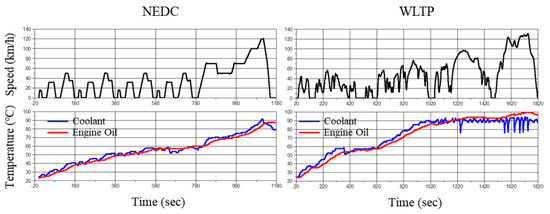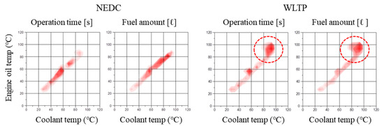 However, under the WLTP mode, the fuel amount did not degrade because the running time under warmed engine condition was increased compared to NEDC. Figure 13 shows the behavior of the coolant and engine oil temperatures per test cycle mode for the diesel vehicle. Figure 14 shows the distribution of the coolant and oil temperatures. The operating time was increased above 80 °C and engine operates under better engine efficiency in the WTLP mode compared to NEDC. This result does not imply that WLTP mode itself always increases fuel consumption rate [L/100 km].