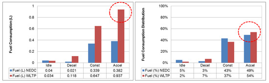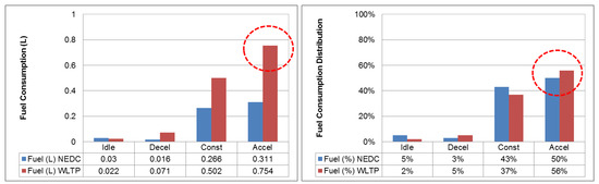 As the test mass and maximum acceleration were significantly increased in WLTP when compared with those of NEDC, the vehicles consumed more fuel in the acceleration zone. Specifically, increases in test mass affected the tire rolling resistance additionally. This was attributed to the increases in fuel consumption at constant speed. Figure 15 and Figure 16 show the contribution of the fuel consumption to the driving conditions with respect to the drive modes for gasoline and diesel vehicle. The fuel consumption increased during acceleration, and the contribution in the overall fuel consumption was also increased by 5–6% in both types of vehicles.