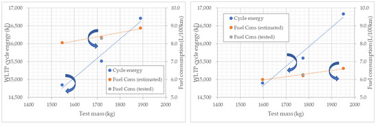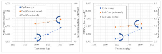 The effects of the test mass on the cycle energy and fuel consumption are presented in Figure 17 and Figure 18. Once road load is determined from coastdown testing, the road coefficients for NEDC are determined according to the regulation. Therefore, the energy can differ under the NEDC cycle even with the same NEDC ETW. Based on the NEDC test weight, the cycle energy values differed by 4.0–7.8%, and the fuel consumption differed by 2.7–5.7% with NEDC. For WLTP, the cycle energy increased by approximately 4% when the road load increased by 10%. Consequently, the fuel consumption increased by approximately 6.4–6.6%.