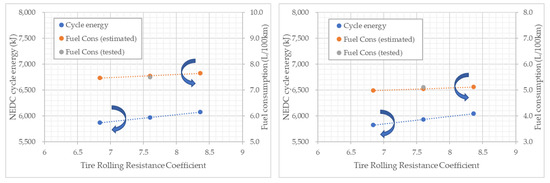 Effect of the tire rolling resistance on the cycle energy and fuel consumption in NEDC (left/right: gasoline/diesel).