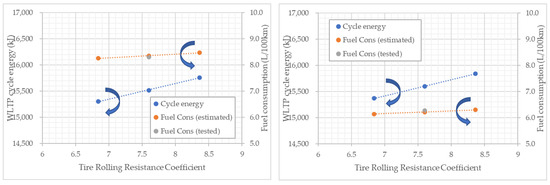 Effect of the tire rolling resistance on the cycle energy and fuel consumption in WLTP (left/right: gasoline/diesel).