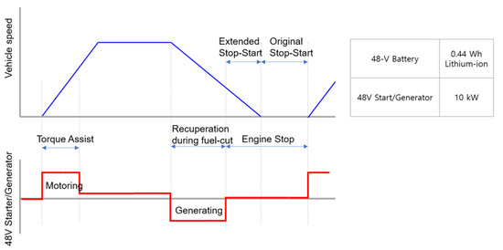 A P0 type of 48-V system was implemented on the diesel 1.6-L engine. For the 10-kW grade MHSG (mild hybrid starter and generator), the electric energy with the regenerative braking was stored during deceleration to assist the torque in starting-and-stopping and driving and to reduce fuel consumption by replacing the electric energy required for driving the vehicle. The idle stop–start technology was applied in the zone with speeds lower than 20 kph during deceleration. This is to ensure that the fuel consumption in the rolling idle zone before stopping the vehicle is not incurred. Figure 23 shows the control strategy of the 48-V motor/generator with respect to the vehicle speed.