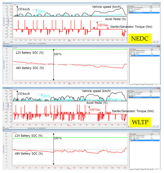 Figure 24 presents measured actual torque and behavior of the battery charging in the 48-V motor under NEDC and WLTP. In the WLTP, there are several deceleration events when compared with that of the NEDC mode. Therefore, the regenerative energy of the 48 MHSG was maximized during deceleration, and MHSG also has a minor torque assistance during launching. The electric energy recovered by MHSG is stored in 12 V battery through a DC-DC converter, and is in charge of various electric loads of the vehicle. This ensured an improvement in fuel consumption under WLTP by approximately 1.5% compared with that in NEDC.