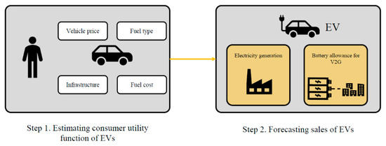 Many of the benefits of V2G technology will appear with the widespread use of EVs and electric vehicle supply equipment (EVSE). Specifically, an EV is a small-sized ESS that holds broad range of kilowatts hour (kWh) of electricity per unit (see Appendix A). Despite the small capacity, if the number of EVs reaches a certain threshold, it will be possible to transmit hundreds of thousands of units of power to the grid at one time. Thus, the diffusion of EVs is essential for the V2G system. An EVSE can be categorized based on the various types of technology and use. To enhance people’s understanding, this study defines the EVSE as a system that allows bidirectional transmission of power between the power grid and the PHEV or EV. For a more precise definition and classification of EVSE, refer to the paper by Noel et al. []. Therefore, the Korean government is trying to increase EV adoption and disseminate V2G technology through various policies. For example, the Ministry of Trade, Industry, and Energy [] aims to distribute 1.14 million EVs by 2022; it also offers incentives to individual consumers, such as subsidies, tax exemptions, and a reduction in highway toll fees and parking fees. Additionally, the Korean government plans to supply 1500–1800 quick chargers and 12,000 destination chargers annually from 2019 to 2022. Simultaneously, the government will enhance the convenience of EV charging by increasing the maximum capacity of quick chargers, build a system that will accommodate the use of all chargers with one membership card, and mandate the installation of chargers in new apartments. In terms of V2G policies, the government aims to proceed with the demonstration of bi-directional charging technology and an integrated V2G operation system. To this end, the government plans to develop on-board chargers for cost reduction; it also aims to establish test beds for the smart grid service to observe EV usage patterns []. Regardless of these policy efforts, there is a lack of research on the impact of EVs and V2G technology on power demand and on the amount of electricity that consumers will allow for V2G energy storage. To address this issue, we analyze the choice and usage behavior of potential EV consumers to grasp the potential magnitude of new distributed energy sources in order to get a proper response to changes in the grid system. Hence, we conduct a conjoint survey and use a multiple discrete-continuous extreme value (MDCEV) model to estimate the consumer utility function of potential consumers. Furthermore, we also conduct a scenario analysis, assuming a variation in the electricity generation mix and battery allowance for V2G energy storage. Figure 1 describes the comprehensive research framework of this study.