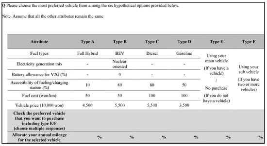 Since the market share of EVs remained near 0% in South Korea [], there is limited revealed preference data with regards to EVs, battery allowance, and energy mix. Therefore, we conduct a choice experiment to collect and analyze the stated preference data about the choice and usage patterns, attitudes toward battery allowance, and energy mix. In the choice experiment, individual respondents select an alternative from a choice set, that is, a set of hypothetical alternatives as a combination of the core attributes [,]. Through this real-world-like process, respondents state their preference for the alternatives, and their utility function can be estimated.