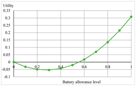 From Figure 3, we can find that the utility of drivers for battery allowance for V2G seems to be convex, with the minimum value at 27.9% of the supply capacity. In other words, we can determine the change in the consumer utility structure for battery allowance. Additionally, when the battery allowance is less than 55.7%, the utility is always smaller than the utility when drivers do not provide electricity for V2G at all. Therefore, we suggest that at least 55.7% of the battery allowance can guarantee potential EV consumer’s benefits. Interestingly, this result suggests that consumers are reluctant to lend electricity below a certain level, and prefer to lend above a certain level; it can serve as a good indicator for government policy to determine an appropriate V2G capacity and incentives for V2G.