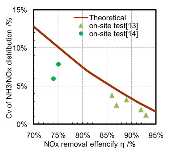 Theoretical and on-site testing comparison of deviation coefficient of the NH3/NOX molar ratio distribution (σ/μ) (Cv) and NOX removal efficiency (under given ammonia slip).