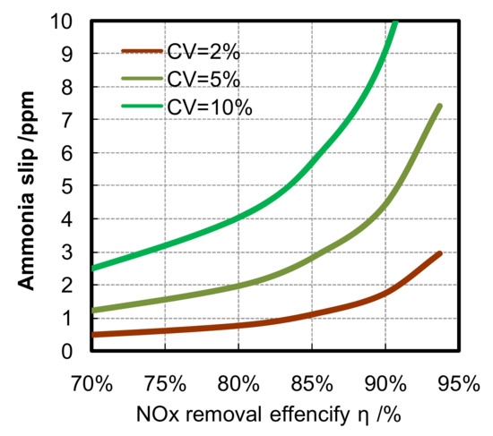 As shown in Figure 7, with the increasing De–NOX efficiency, the deviation coefficient should be less than a certain value. The high De–NOX efficiency requires much stricter deviation coefficient. In a given SCR device neglected catalyst activity condition, if the target De–NOX efficiency is required to reach 85%, the recommended deviation coefficient of NH3/NOX should be less than 5% to maintain the ammonia-slipping less than 3 ppm. If the target De–NOX efficiency is 95%, the deviation coefficient of NH3/NOX should be less than 2% for the given ammonia-slipping (3 ppm). This result is consistent with the operating experience. As the deviation coefficient is nearly impossible to reach 2% in cross-section of large plant, the SCR efficiency cannot reach 95% normally. Even more catalyst is used, the excessive ammonia-slipping is still very high under this condition [40,41].