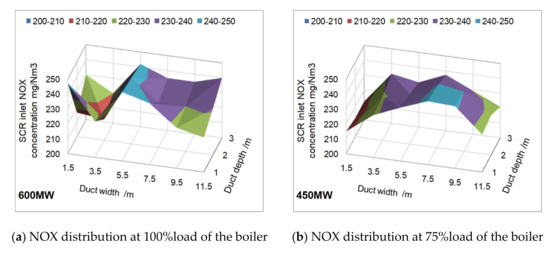 According to the above analysis, by improving the distribution uniformity of ammonia and NOX, it is possible to reduce the ammonia-slipping of SCR and ensure the high De–NOX efficiency. In the real power plant, the load fluctuation and the combustion adjustment can cause the gas flow field changing in SCR. As a result, especially for the NOX distribution at the inlet of SCR, it should change correspondingly with adjustment of combustion [42,43,44,45].