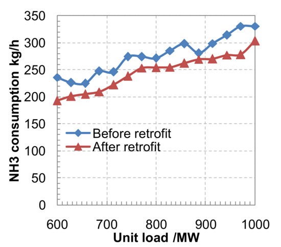 At the same time, the ammonia consumption of the unit decreases after the implementation of the technology substantially. As shown in Figure 11, the ammonia consumption of at different loads in this 600-MW unit decreases by 10% averagely. The ammonia-slipping and AH plugging problem are alleviated effectively.