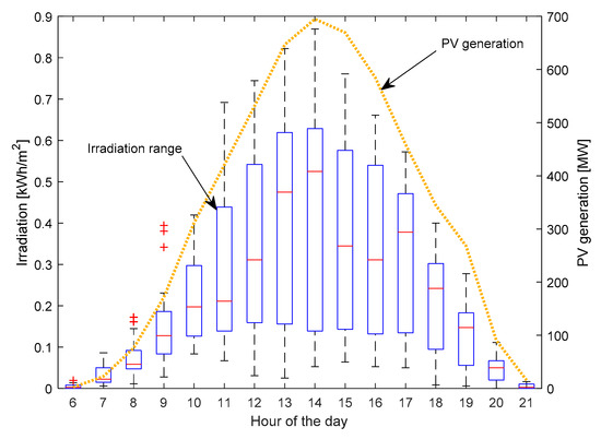 The energy yield from photovoltaic modules is a function of irradiation falling on the module area, the modules’ efficiency, and their temperature. Since detailed information about the PV systems’ location is currently not available to the authors, nor is the specification of the modules used, it is justified to use a black-box approach where the input data are transferred into desired output. Because the temperature of the PV modules is determined by irradiation and ambient air temperature as well as wind speed, which has a cooling effect, the above-mentioned meteorological parameters have been considered as explanatory variables. To simulate an hourly power generation from PV systems in Poland, a set of 69 (3 meteorological parameters from 23 stations: Bielsko-Biała, Gdynia, Gorzów Wielkopolski, Jarczew, Jelenia Góra, Kasprowy Wierch, Kłodzko, Koło, Koszalin, Legionowo, Legnica, Łeba, Łódź, Mikołajki, Piła, Radzyń, Sulejów, Suwałki, Toruń, Warszawa-Bielany, Wieluń, Włodawa, and Zakopane – please see Figure 1) explanatory variables was used. These explanatory variables exhibited various correlation coefficient values with the response variable. For the irradiation, it was on average 0.777, whereas the air temperature and wind speed were, respectively, 0.439 and 0.299. Figure 2 shows the observed hourly irradiation on the 1st of May 2020 and the production of energy from PV systems at the national level. During that day, the observed irradiation in individual hours varied significantly among considered locations (meteorological stations), while the PV systems maintained a relatively smooth energy generation pattern. This phenomenon can be attributed to the spatial smoothing of power generation due to the geographical dispersion of the PV systems [20]. This situation is beneficial from the perspective of variable renewable energy sources (VRES) integration to the power system, although constraints such as transmission network capacity may limit the benefits resulting from spatial smoothing.