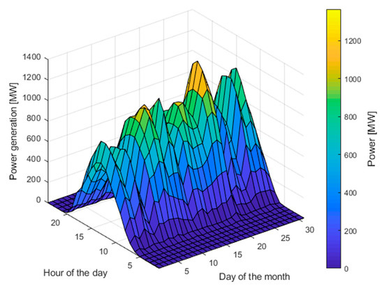 The generation from PV systems during the whole period is visualized in Figure 3. Significant variability between individual daily yield sums can be observed. On a side note, accordingly to the PSE data in May, the PV systems generated 223 GWh, whereas wind turbines generated almost 1.072 TWh, which contributed to covering, respectively, 1.8% and 8.6% of the national demand in this month.