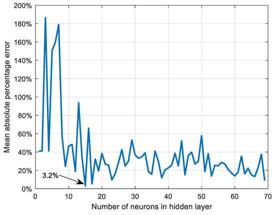 As mentioned in the Methods and Data section, in total 69 potential configurations of the ANNs were tested. For those, the one with the lowest MAPE was selected for further analysis. The performance of the selected and the remaining ANNs as a function of the number of neurons in the hidden layer is presented in Figure 4. The best performing ANN had 15 neurons in the hidden layer and MAPE of 3.2%.