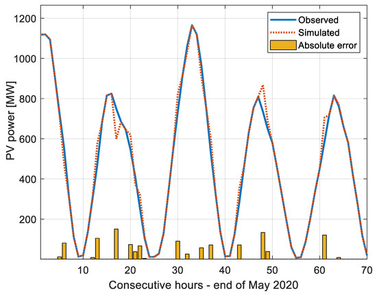 Figure 6 visualizes the performance of the neural network over a period of 4.5 days by the end of May 2020. The night hours are excluded from the analysis. As shown in the figure, the values simulated by the ANN followed the real PV systems generation well. During the second day, the ANN wrongly simulated a sudden drop in PV generation, increasing the variability of the modeled time series (in terms of ramp rates). During the fourth day, one can observe that in the midday hours the simulated generation was slightly greater than the observed one. In general, the absolute errors did not exceed 150 MW.