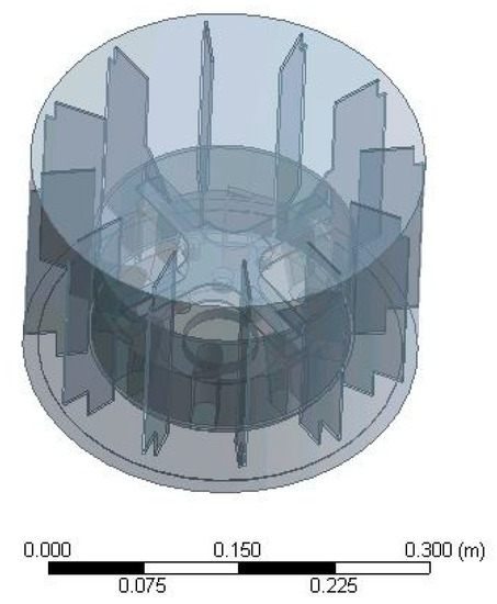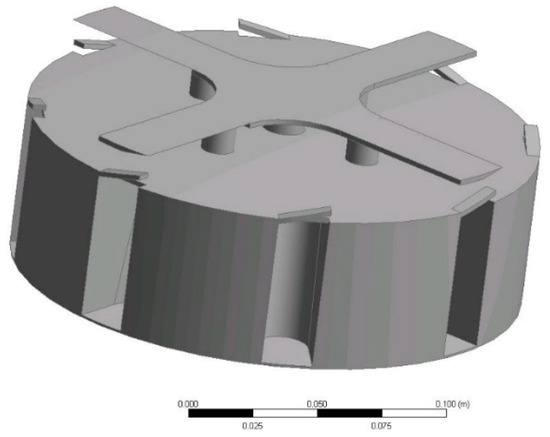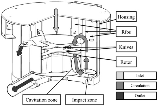 The model implementation consists of three main parts: geometry designing, mesh generation, and implementation of boundary conditions and solver settings. As mentioned before, the sewage sludge disintegrator was designed in the scope of previous works, published in references [17,40]. The device was adjusted for agricultural substrates disintegration by adding shredding knives (Figure 1). Moreover, implementation of ribs was proposed to create another disintegration zone (Figure 2). The accelerated fluid at the outlet of the rotor faces the ribs, causing rapid velocity decrease contributing to the disintegration of the substrate. For the purposes of assessment of the new design, one of the objectives of this study was the comparison of the performance of two designs.