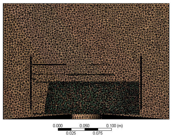 The computational grid was generated for the presented domain. For this purpose the automatic method was used. The face maximum size was set to 0.005 m. Additional face sizing (0.003 m) was applied on the rotors’ surfaces, to obtain more occurance results as the most dynamic processes are predicted there. Main mesh parameters are presented in Table 1. The applied mesh is presented in Figure 3.