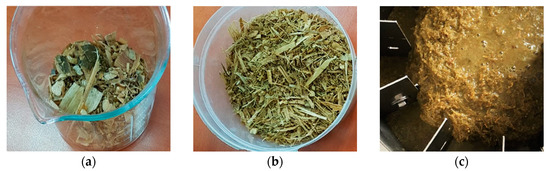 Maize silage: (a) Raw maize silage; (b) shredded maize silage; and (c) hydrated maize silage used in the hydrodynamic disintegration process.