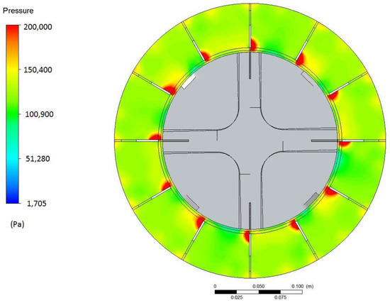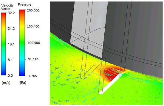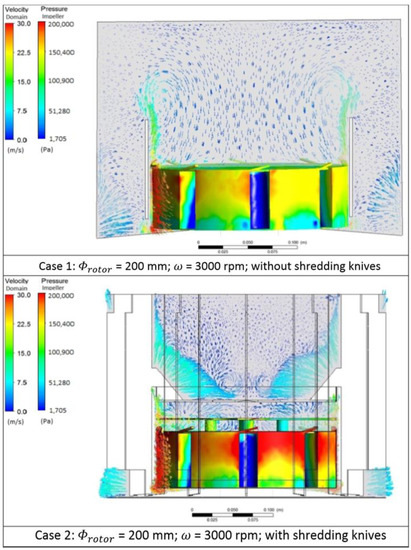 The comparative analysis covered two geometries of the device (original variant, without shredding knives; modified variant, with shredding knives) with a rotor diameter of 200 mm at nominal rotational speed of 3000 rpm. The scope of work implemented for the purposes of this article included no calculations for the HDS device, but only for the HDA. Results for the HDS device were implemented in the scope of earlier studies, and were presented in reference [40]. The presented analysis aimed at the determination of the effect of application of additional shredding elements on the distribution of pressure and speed in working spaces of the rotor. The character of flow in the zone of liquid outflow from the rotor in the vicinity of the ribs was also determined. The results are presented in Figure 5 as pressure fields on the rotor surface, and liquid speed vectors. The presented simulation results show that in both cases a decrease in pressure below saturation pressure (1705 Pa, lower limit of the scale in the figures) was observed in the rotor area. Cavitation zones have an approximate size, the HDA to HDS low pressure zones volume ratio is equal to 84.64%; therefore, no significant negative effect of the introduction of shredding knives on the pressure distribution in working spaces of the rotor was observed. Despite the flow character change around the rotor caused by the needed modification implementation (shredding knives), it can be concluded that the rotor is still able to create a low pressure zone of satisfactory size. In the modified variant, a change in the character of flow above the rotor was also observed. An increase in pressure at the rib base, at the outlet from the rotor, suggests the existence of the impact zone, where disintegration of substrates can also occur, as presented in Figure 6 and Figure 7. Moreover, the geometry with the existing knives and counter knives is characterised by increased pressure on the lateral wall of the rotor.