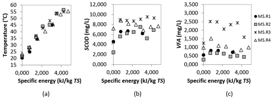 Effect of specific energy on: (a) Temperature of maize silage; (b) SCOD; (c) VFA release from maize silage.
