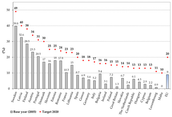 In 2009, a new Directive (2009/28/EU) on the promotion of energy production from renewable energy sources was introduced [13]. Its provisions brought about a complete change of approach in the RES sector and in the functioning of the energy market [14]. The introduction of Directive 2009/28/EU unified the regulations and additionally introduced provisions concerning the production of heating and cooling from RES. Therefore, the new regulations allow the covering of all areas for RES development, electricity, heating and cooling and biofuels. Directive 2009/28/EU defines common objectives for the aforementioned areas, while offering the Member States flexibility in the implementation of individual solutions. However, it should be mentioned that the obligation of 10% use of biofuels in the transport sector was imposed. Figure 1 presents the objectives provided in the Directive for each of the Member States, as well as the output in the base year [13,15].