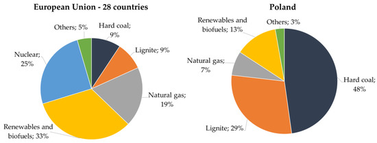 According to the data presented in Table 3, the share of renewable energy sources will change significantly in the fuel mix of the Polish electricity generation sector by 2030. Figure 2 shows the current (year 2018) energy mix in the EU and Poland.