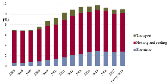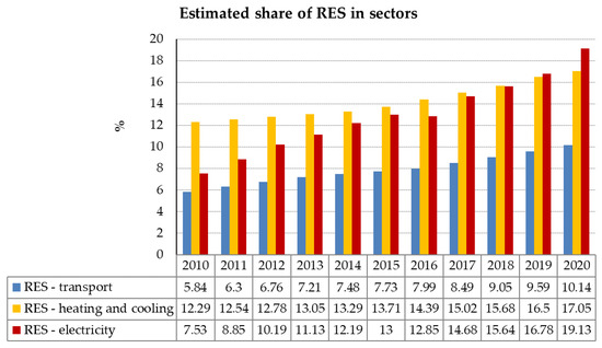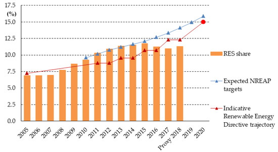 Share of renewable energy generation in different sectors according to the National Renewable Energy Action Plan [30].