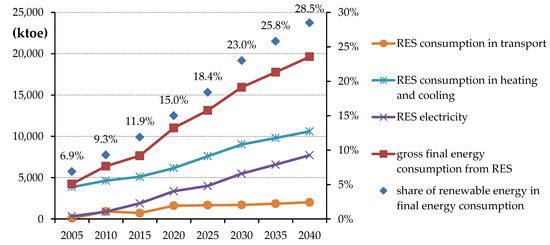 Demand for gross final energy from renewables in Poland, ktoe (adapted from [15]).
